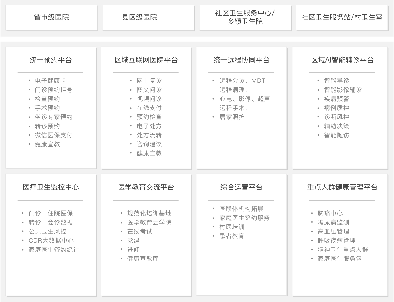 旨在建立区域一体化管理平台,无缝连接各级医疗机构,采用互联网、远程医疗、人工智能、大数据等技术进行信息共享、资源互助,迅速提升区域医疗整体服务能力。
