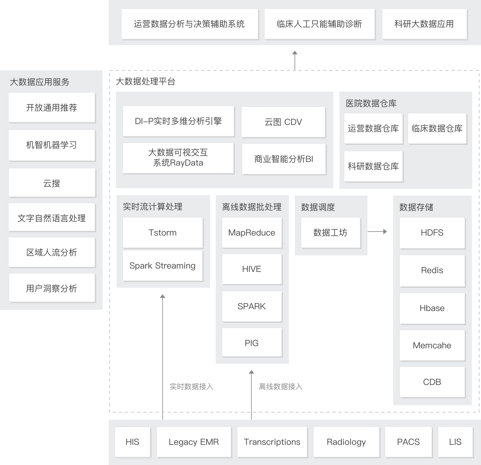 - 运营大数据:通过医院运营数据中心充分、合理、灵活的利用现有医疗资源,实现资源的统筹管理和配置优化,提高医疗服务质量和服务效率;对潜在发生的流行病、传染病等医疗事件进行分析和预测,以判断就诊病人趋势、药品库存等,提前进行资源的调配,做到医院资源智能化管理;通过大数据多维分析、实时大屏展示,为医院提供直观的、全方位的数据呈现,全面提升医院管理决策能力。